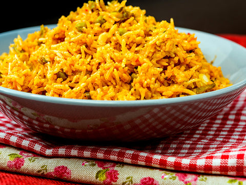 Ingrédients : riz blanc, bouillon de légumes, pois verts, oignon, poivron rouge, chorizo, huile d'olive, sel, curcuma, safran.