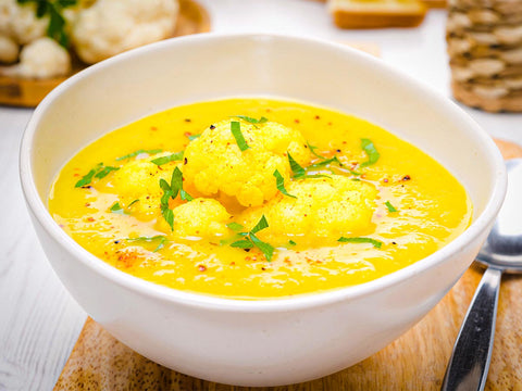 Ingrédients : chou-fleur, pois chiche, oignon, céleri, lait de coco, ail frais, huile d'olive, vinaigre de cidre, sel, poudre de cari, poivre.