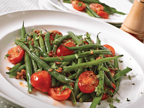 Ingrédients : Haricots verts, Tomates cerises, Huile d'olive, Épices, Ail, Sucre, Sel et poivre.